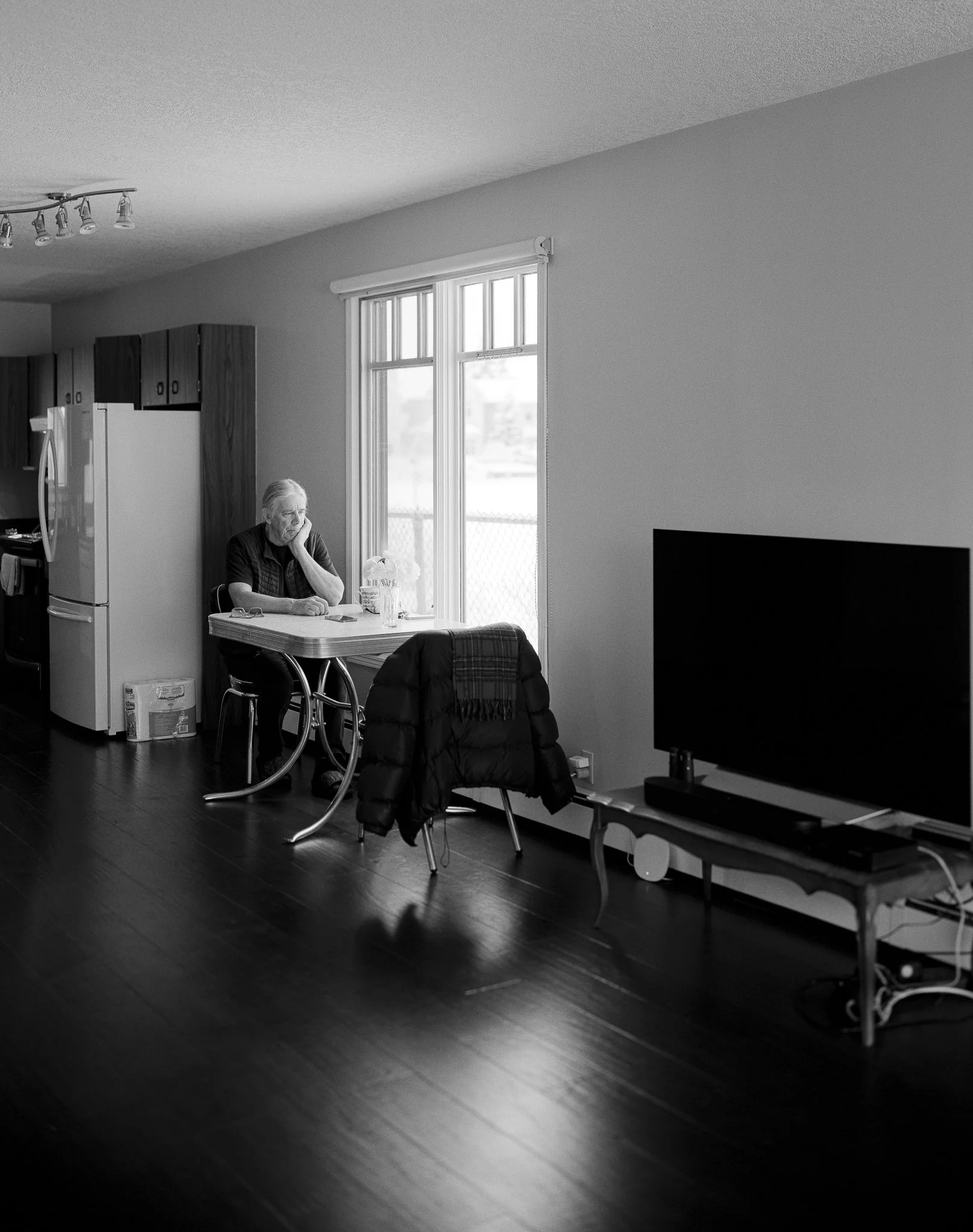 Peter listed his house for sale in 2024. Wendy—his wife—had since moved out after their 45-year marriage. Sheila, their daughter, passed away in 2016. Her final request was for those she left behind to continue to enjoy life. A bed, television, camping chair, some plants, and a room full of photographic darkroom equipment kept Peter company throughout the fall. His plans to move to Victoria island did not include taking his darkroom with him. While loading a rented truck with his donated photography equipment—he told me about his life and grief. Returning to photograph the home and the man in it, I got to know Peter well enough to call him my friend.